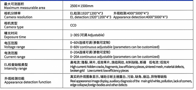 - 专业解读:该参数代表设备单次可检测的光伏组件最大尺寸,2500×1500mm 的规格完全覆盖当前主流 182/210 大版型组件,甚至可适配超宽、超长的定制化组件,兼容性拉满。可测面积越大,对未来组件大尺寸化趋势的适配性越强,能满足多规格、大版型组件的检测需求,避免产线升级后设备淘汰。