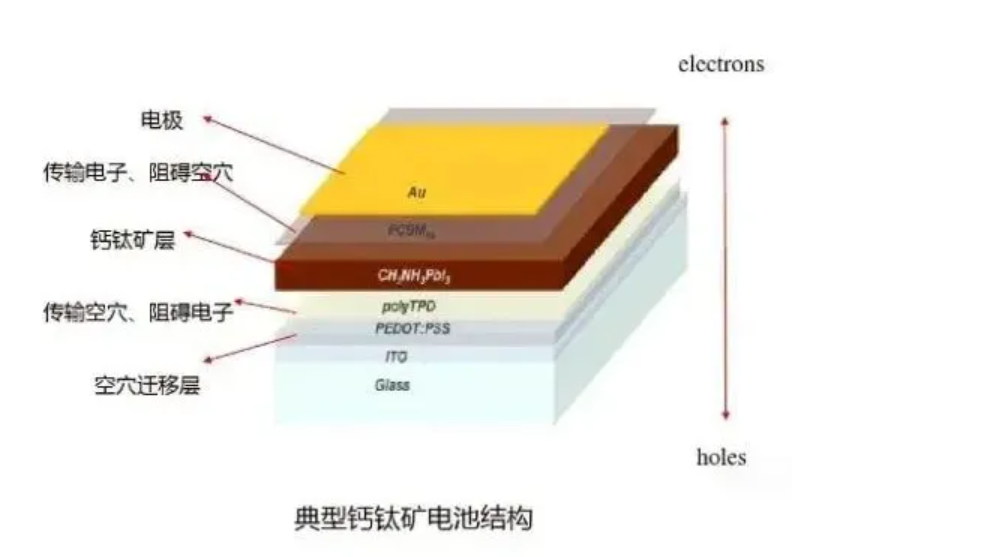 钙钛矿电池的结构主要由以下几个关键部分组成:透明导电基底、电子传输层、钙钛矿吸光层、空穴传输层和金属电极。这些组成部分共同协作,使得钙钛矿电池能够有效地吸收太阳光并将其转化为电能。