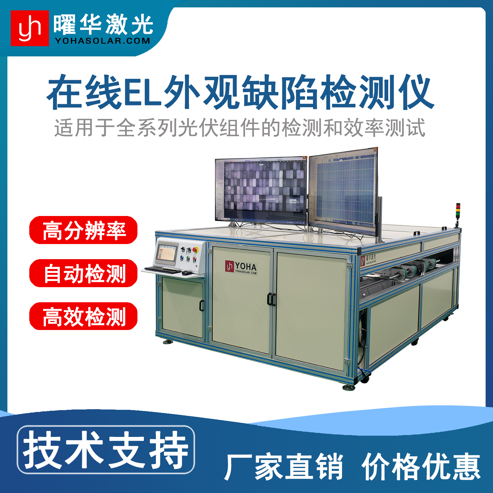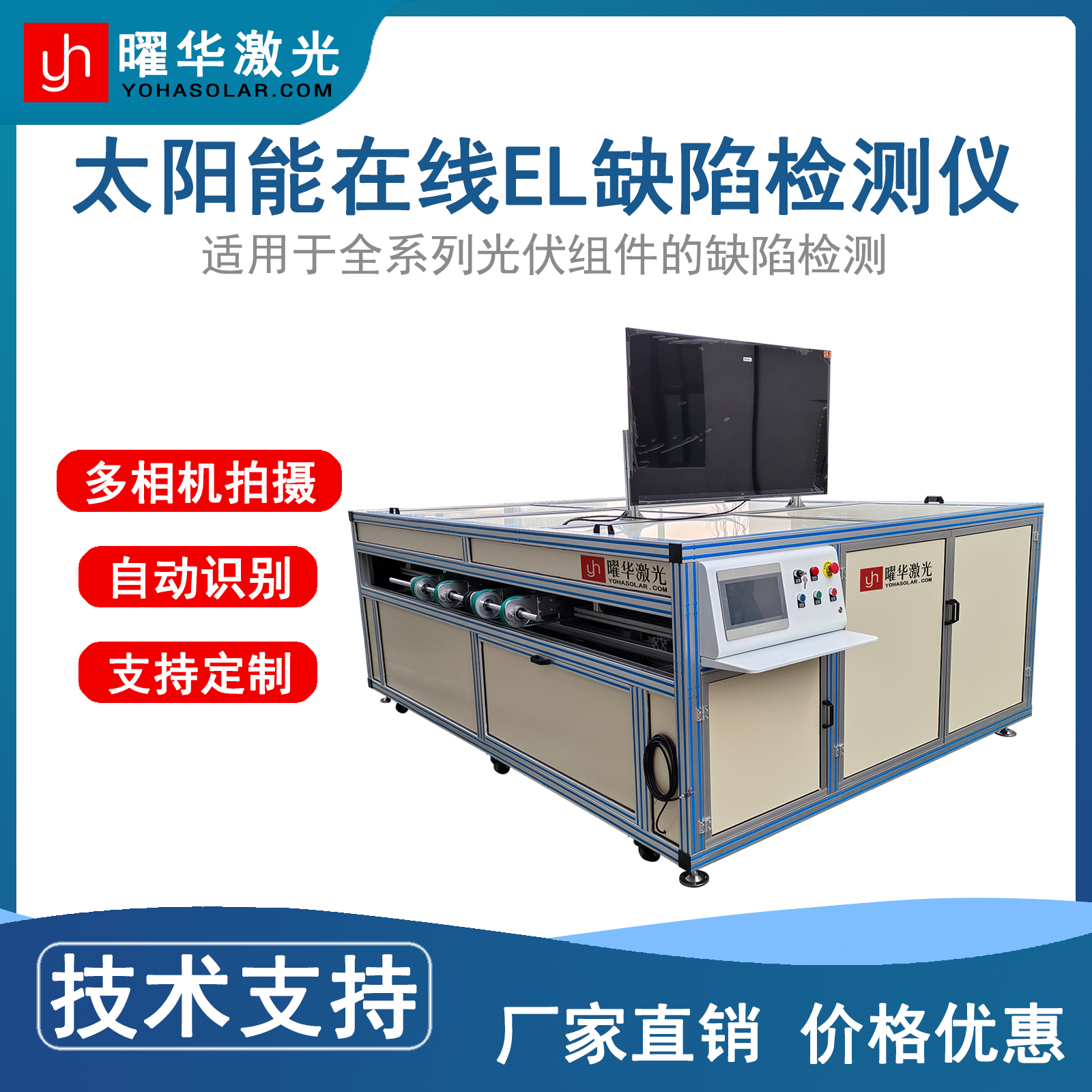 武汉曜华激光科技有限公司(高新技术企业)成立于2014年,员工规模100多人,其中研发团队占比超50%,核心成员来自华中科技大学、武汉大学等高校。公司拥有3个生产基地、20000平米标准化厂房,构建完整生产链,主营光伏组件生产全流程关键设备,如EL测试仪、IV测试仪、划片机、串焊机等,并为客户提供生产线解决方案与全周期服务,产品与服务获海内外广泛认可。