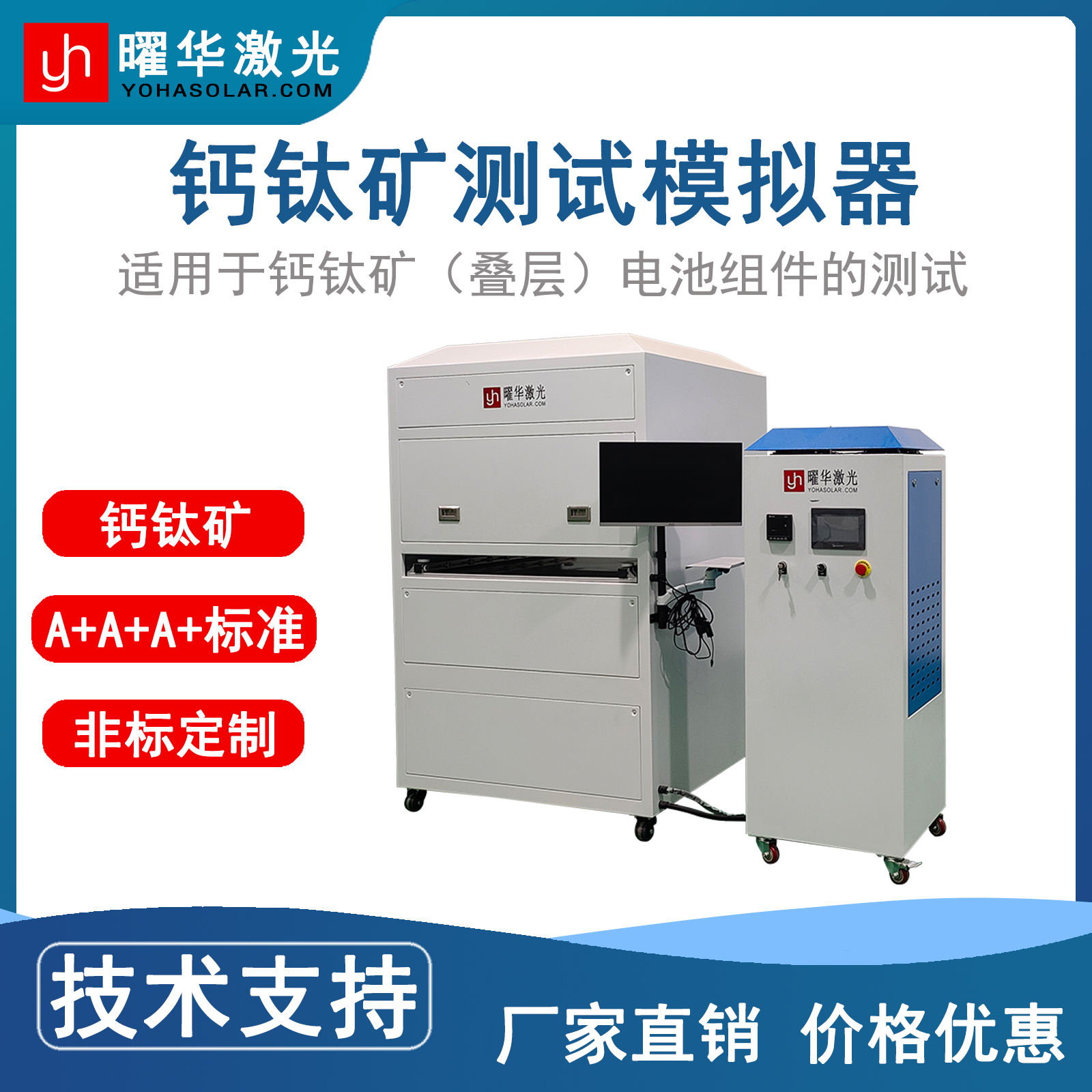 加速老化测试:通过提升温湿度、光照强度等环境应力,加速电池性能衰减进程,大幅缩短测试周期,同时严格把控加速因子,确保测试结果与实际工况高度相关,避免过度加速导致数据失真;户外自然老化测试:选取典型气候区域开展实地长期测试,记录地理位置、气象参数,评估电池真实户外服役耐久性,同步对比实验室加速测试数据,完善全场景稳定性评估体系。曜华激光本解决方案立足钙钛矿电池产业发展痛点,融合国际标准、高端设备与标准化流程,可灵活适配实验室研发、中试验证、量产质控等多场景需求,助力企业攻克钙钛矿电池稳定性难题,加速技术成果转化。未来,曜华激光将持续迭代测试技术、优化设备性能,为钙钛矿光伏产业高质量发展提供全链条检测技术支撑。