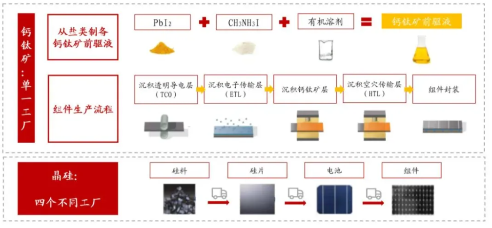相较于硅基太阳能电池的关键优势,除了实现与硅太阳能电池相当的高效率外,PSC还提供了几项优势,使其成为比硅更具吸引力和多样化的技术。钙钛矿电池未来在原材料、生产环节、能耗上具有一定的成本优势。